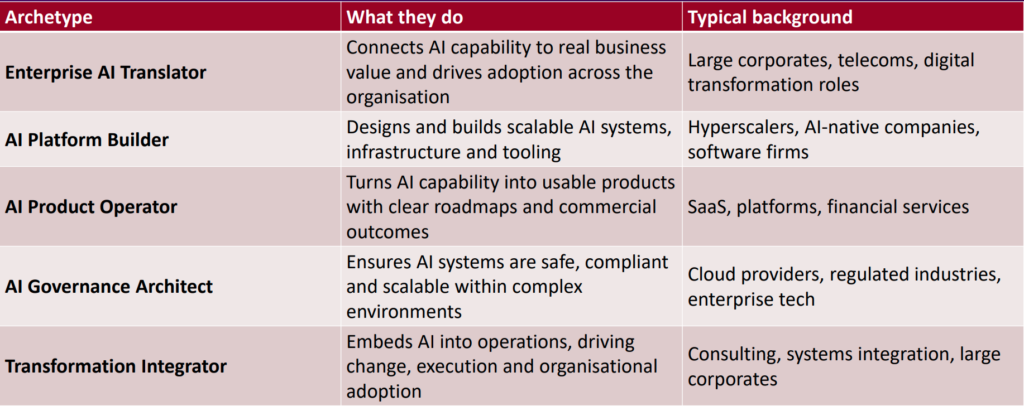 Each archetype typically emerges from different environments, including large corporates, consulting firms, hyperscalers, and AI-native companies.