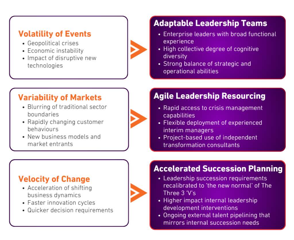 With volatility, variability and velocity as the defining attributes of the environment leaders now face, organisations need to develop three corresponding leadership capabilities.