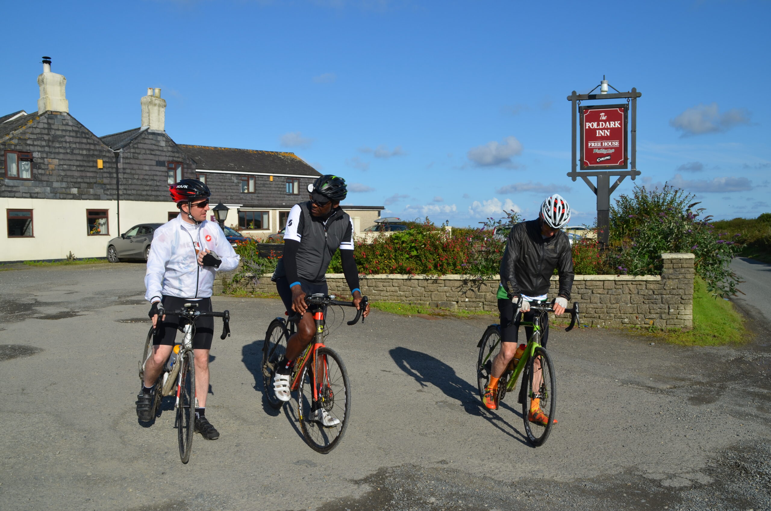 With light fading and hunger setting in, after 7 hours in the saddle, we see the signs for the Poldark Inn. Peter is patiently waiting, his camera lens fixed as we arrive and alight.