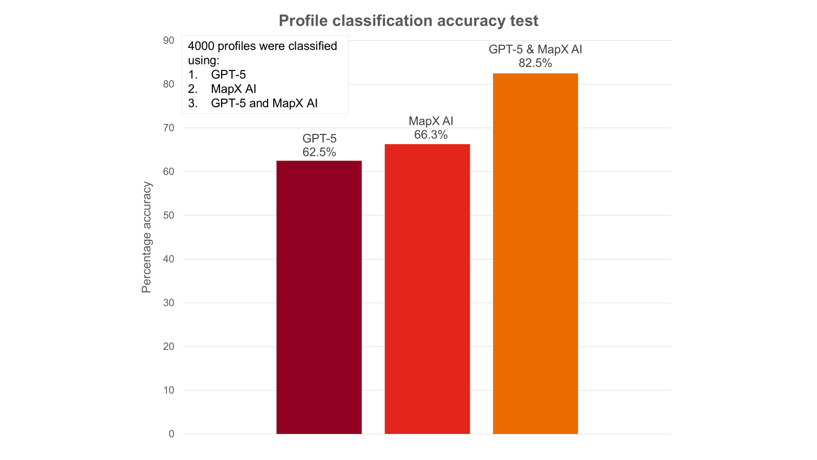 MapX and GPT-5 working together were 32% more accurate than GPT-5 only. Or to put another way, the combination of MapX AI’s translation layer with GPT-5 delivers 53% less classification errors compared to GPT-5 alone.