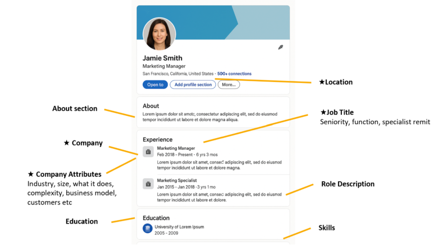Some data points are binary and reliable: location (current and historic) and companies worked at. Some are contextual but still strong: seniority progression, tenure, industry exposure, company characteristics (size, regulation, B2B/B2C, etc.). Others are weaker: self-authored summaries, skills lists, free-text keywords.