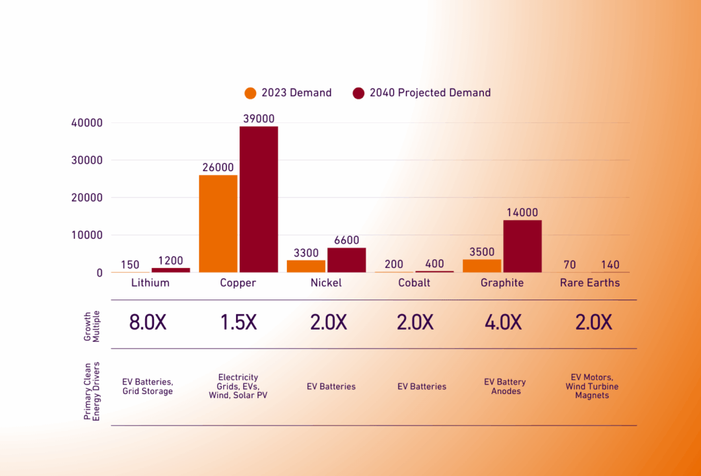 Under the Stated Policies Scenario (STEPS), which reflects current policy settings and announced pledges, the demand trajectory to 2040 is already formidable. Lithium demand is projected to increase fivefold from today’s levels, while demand for graphite and nickel is set to double. Consumption of cobalt and rare earth elements is expected to grow by 50-60%, and copper, which already has a large established market, will see demand rise by 30%. [7]