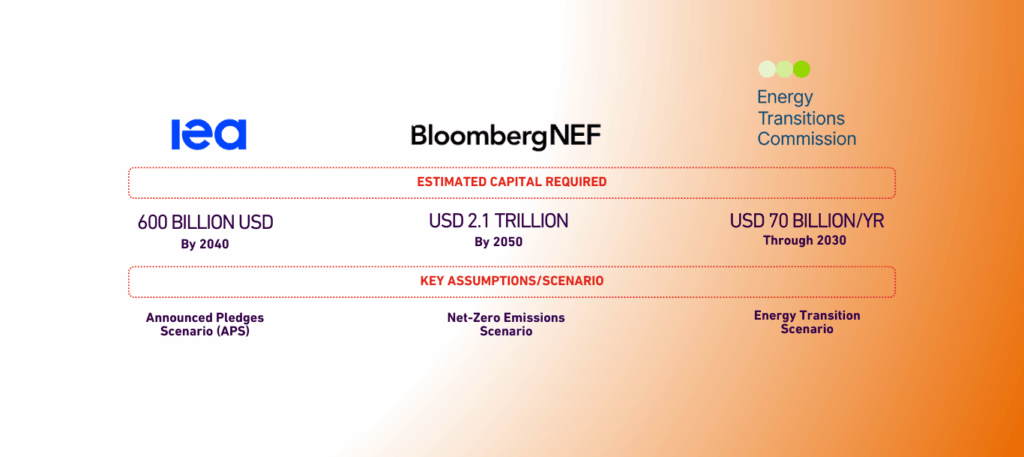- The Energy Transitions Commission (ETC) focuses on the immediate term, concluding that annual capital investments in key energy transition metals must increase from the current $45 billion to an estimated $70 billion per annum every year through to 2030. [11]