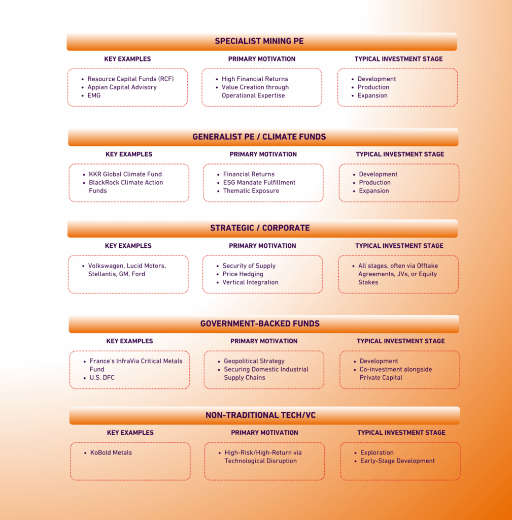 The capital flowing into critical minerals is not monolithic. Private equity is one component of a complex and rapidly diversifying ecosystem of financial players. Understanding the motivations and roles of each segment is essential to grasping how the overall funding gap can be bridged. This ecosystem is increasingly characterised by a “blended finance” approach, where different types of capital collaborate across the project lifecycle. [19]