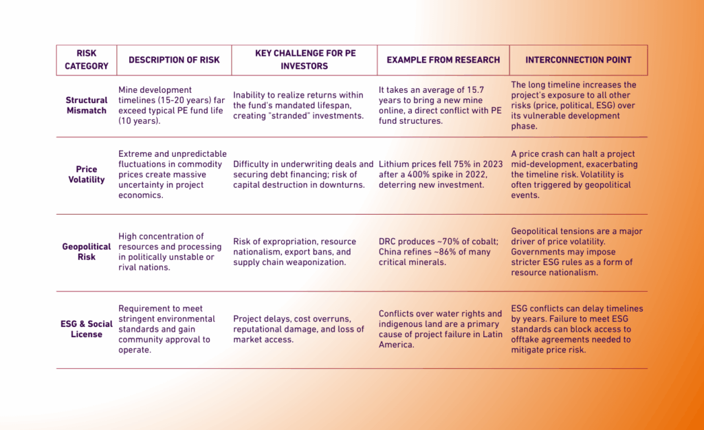 This influx of capital serves a dual purpose. It provides much-needed funding for exploration and development, and it also acts as a powerful validation signal to the broader financial community. The participation of sophisticated PE firms is seen as a de-risking event in itself, which can help attract a wider pool of private capital, including generalist investors who may have previously perceived the risks associated with mining as insurmountable. [17] Private equity investors are drawn by the clear and significant growth potential of the critical minerals sector, but their entry is tempered by the need to navigate a complex and multifaceted risk landscape, spanning from exploration and extraction to processing and end-use markets. [18] The central theme of the current era is PE’s adaptation to this new frontier, developing strategies to harness the immense opportunity while mitigating the inherent challenges.